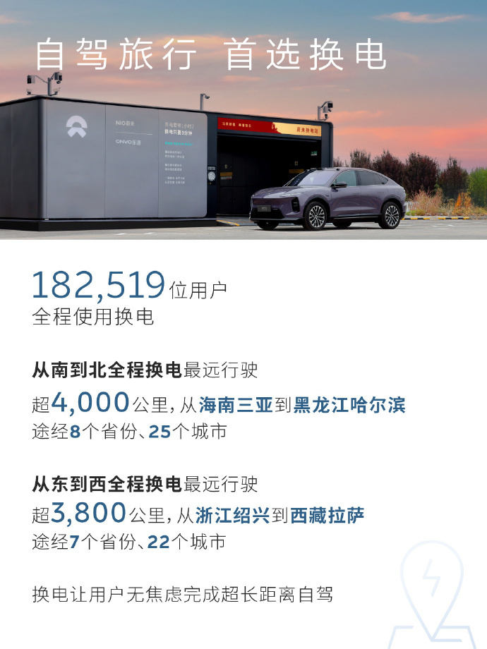 凤凰网科技讯 2月26日,蔚来汽车2026春节加电报告出炉。报告显示,累计换电超207万次,较去年春节日均增长29.4%。提供高速公路充换电量超2500万kWh,占全国高速公路充换电量15%。此外,超18万用户全程使用换电,从南到北全程换电最远行驶超4000公里。从东到西全程换电最远行驶超3800公里。
