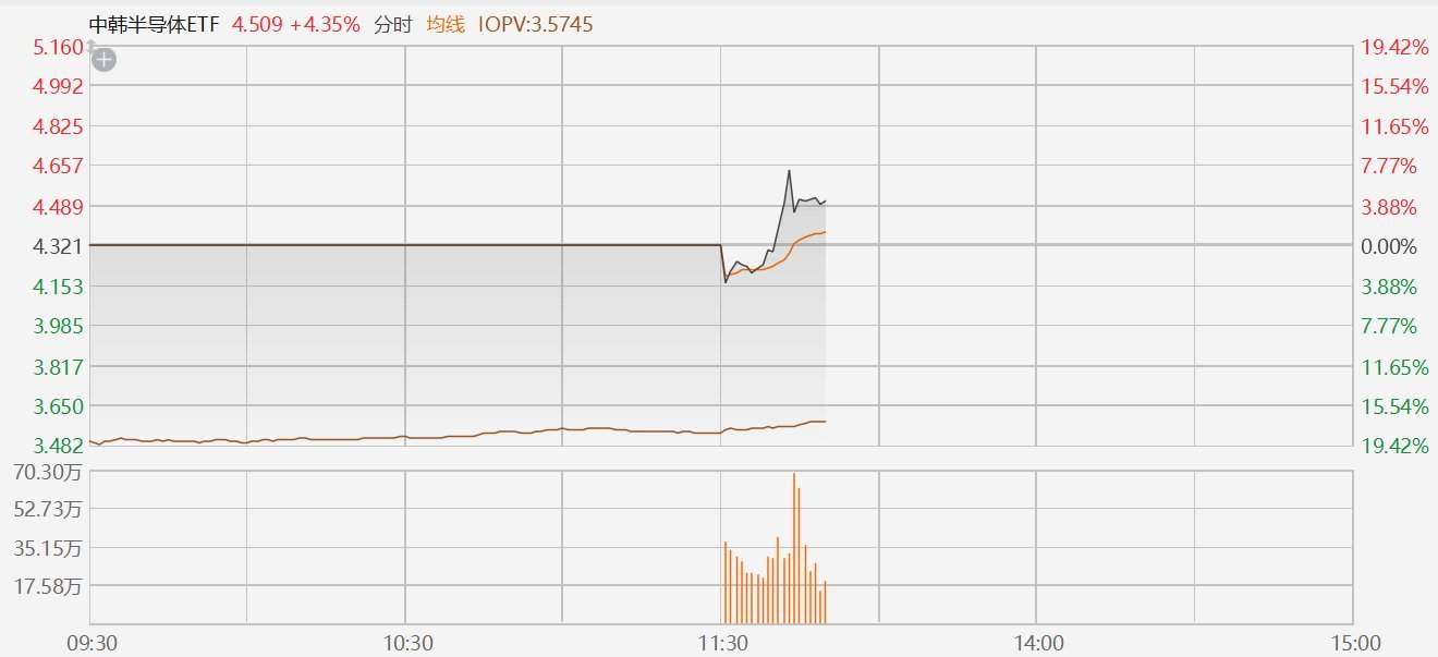 中韩半导体ETF拉升涨超7%,溢价率达26.16%