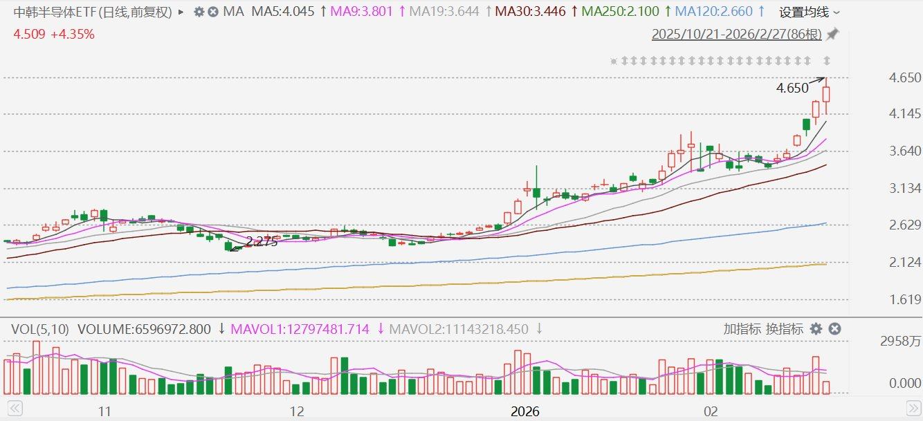 随着韩股盘中由跌转升,A股市场中韩半导体ETF(513310)午后开盘下挫后快速拉升,一度涨超7%,报4.65元,创历史新高,目前溢价率达26.16%。自去年10月以来,该基金因高溢价持续对外发布风险提示。根据最新披露的信息,该基金前五大重仓股分别为三星电子、SK海力士、寒武纪、中芯国际、海光信息。