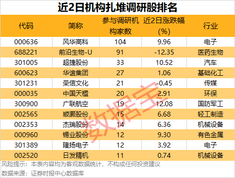 近两个交易日(2月25日至2月26日)共有22家公司公告机构调研记录,其中,12股有10家以上机构扎堆调研,风华高科(000636)最受关注,有104家机构调研;其次是前沿生物-U,有91家机构调研。