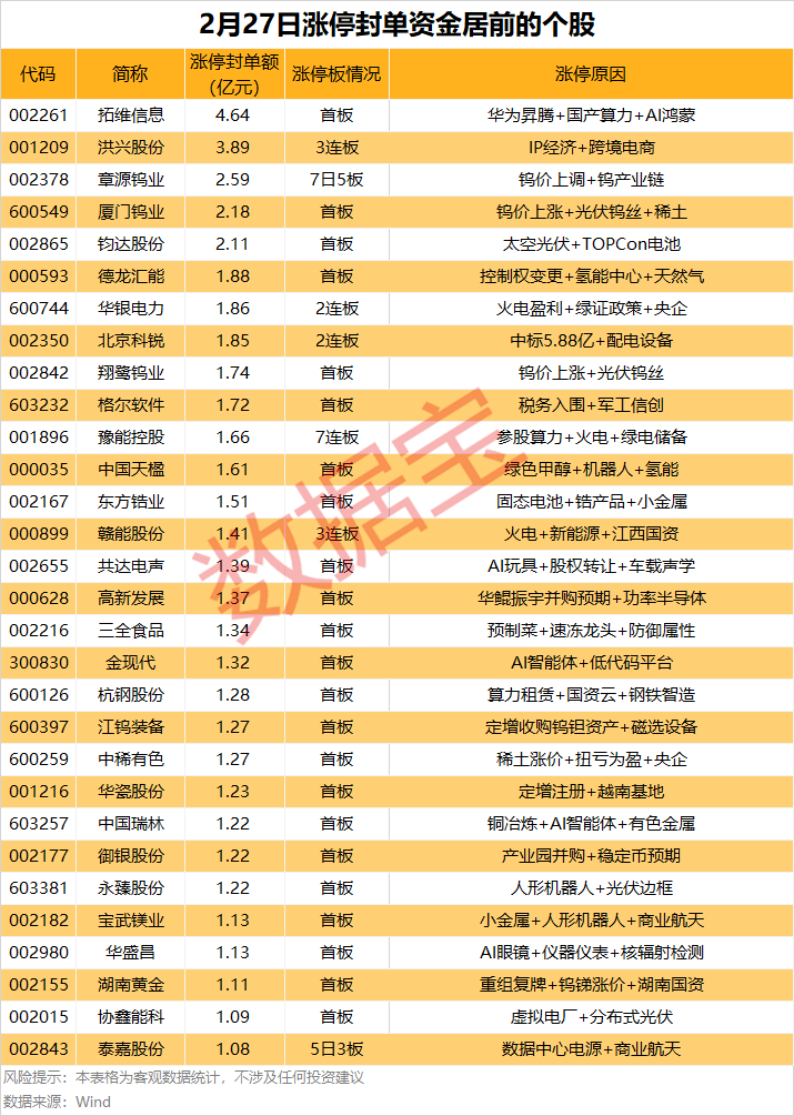 以封单金额计算,拓维信息(002261)、洪兴股份、章源钨业(002378)涨停板封单资金居前,分别有4.64亿元、3.89亿元、2.59亿元。