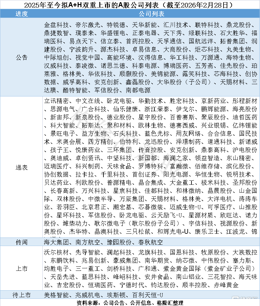 截至2026年2月27日,已有100多家公司处于A+H的不同阶段。(相关列表见文末)