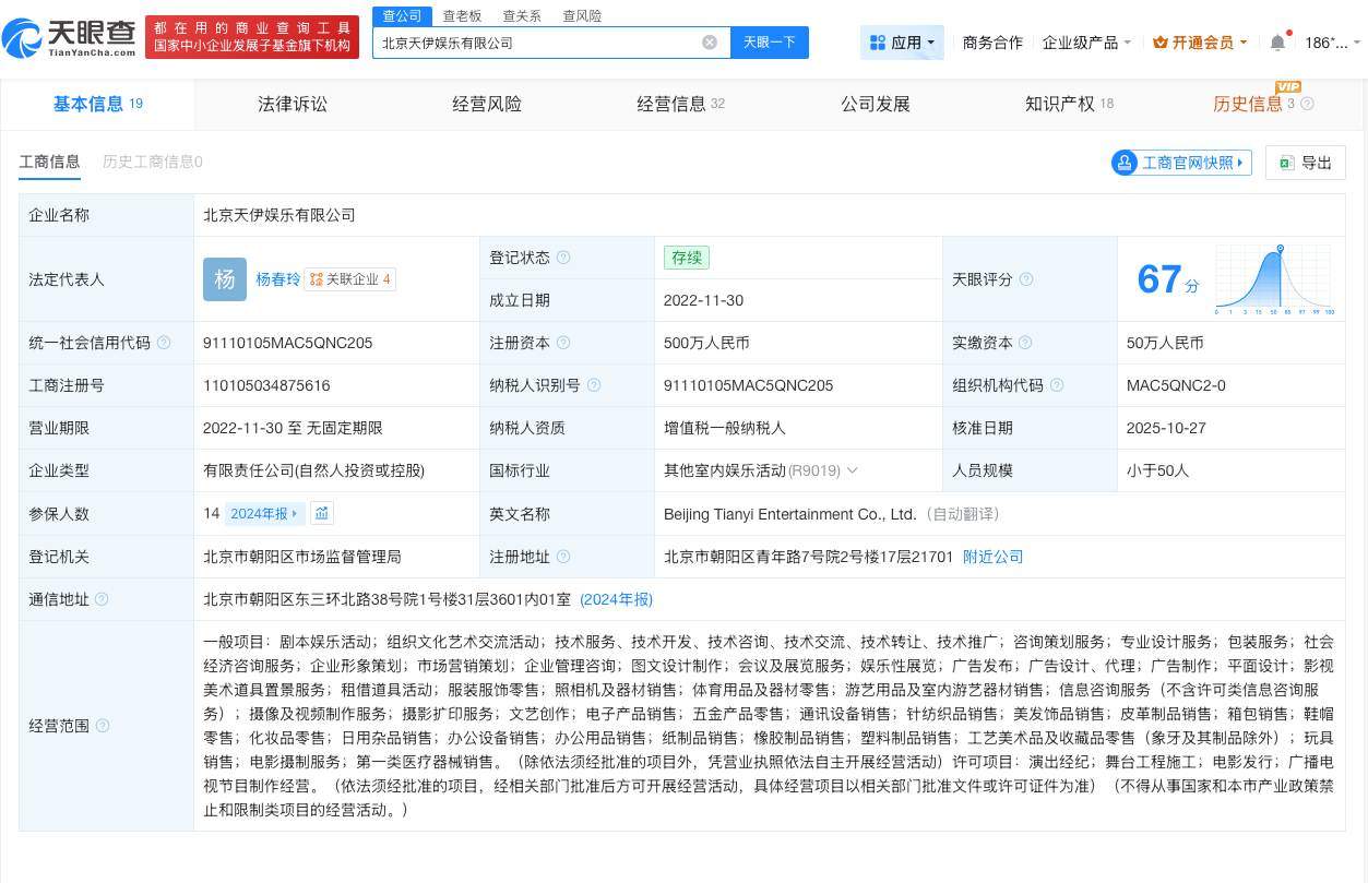 天眼查工商信息显示,天伊娱乐关联北京天伊娱乐有限公司成立于2022年11月,法定代表人为杨春玲,注册资本500万人民币,经营范围包括剧本娱乐活动、组织文化艺术交流活动等。股东信息显示,该公司由杨幂母亲杨春玲、诗摇、共青城尘星及月投资有限公司共同持股。
