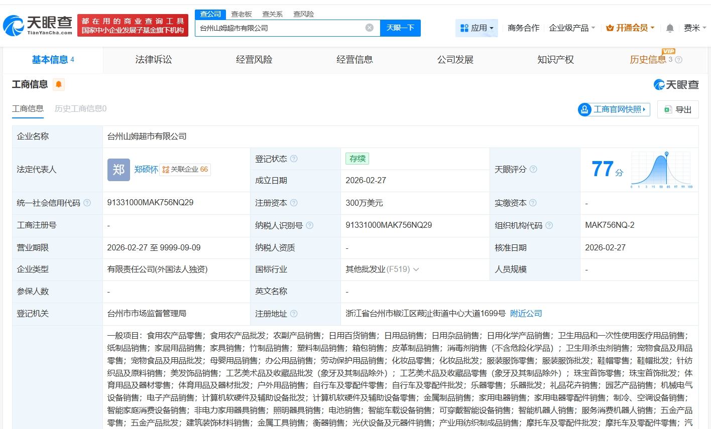 天眼查App显示,近日,台州山姆超市有限公司成立,法定代表人为郑硕怀,注册资本300万美元,经营范围含食用农产品零售、食用农产品批发、日用百货销售等,由山姆(上海)投资有限公司全资持股。