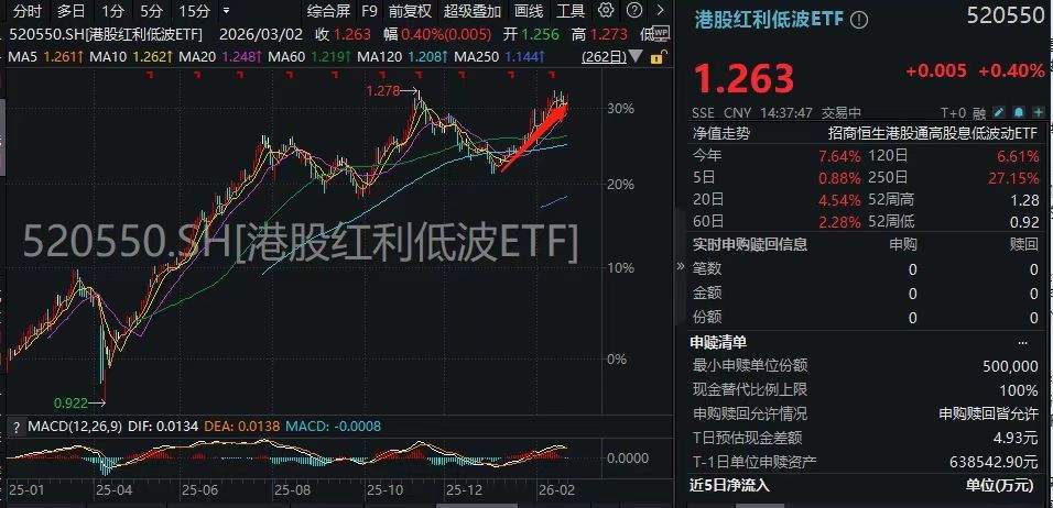 3月2日,当市场目光仍聚焦在地缘冲突引发的避险狂欢时,一只低调的港股ETF正悄然逼近历史巅峰。截至下午14时31分,港股红利低波ETF(520550)上涨0.40%,盘中更高触及1.262元,距离其历史新高1.278元仅一步之遥,差距不足2%。在当前市场剧烈波动的背景下,这一稳健的突破态势显得格外珍贵。