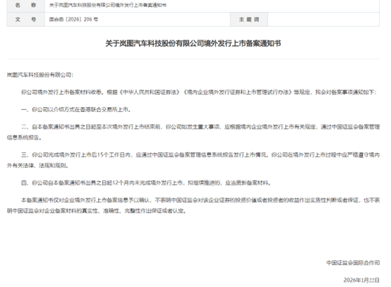 1月28日,中国 *** 国际合作司发布《关于岚图汽车科技股份有限公司境外发行上市备案通知书》。岚图汽车拟以介绍方式在香港联合交易所上市。岚图汽车完成境外发行上市后15个工作日内,应通过中国 *** 备案管理信息系统报告发行上市情况。岚图汽车自备案通知书出具之日起12个月内未完成境外发行上市,拟继续推进的,应当更新备案材料。