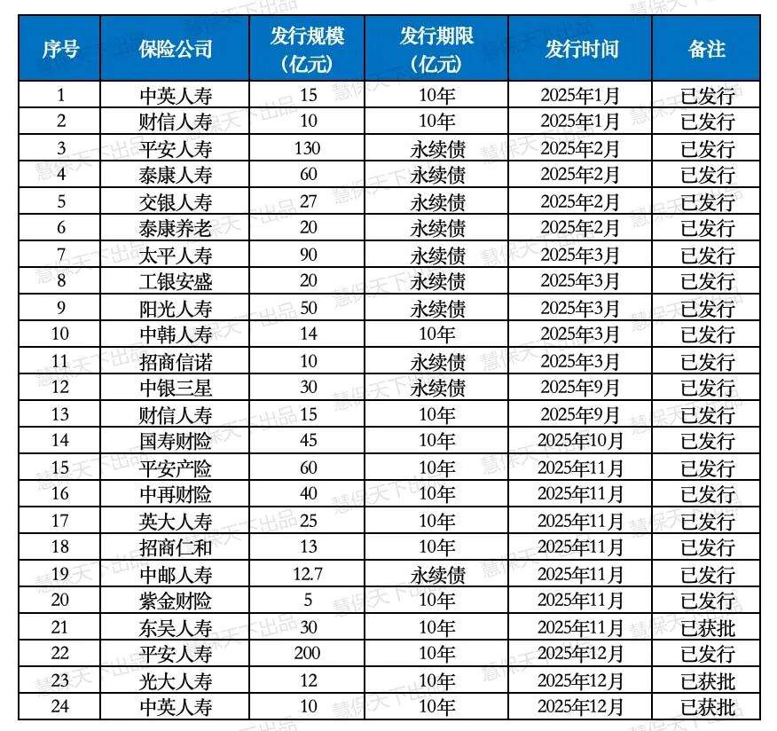 发债的门槛之高,让绝大多数中小险企望而却步。债券发行需经过央行与监管部门的严格审批,对发行人的资质、经营状况、风险水平有着极高要求。从数据来看,2025年内全行业仅有24家险企成功获批资本补充债或永续债,总规模达1042亿元,单家平均发行规模近40亿元,但这些名额多为头部险企:平安人寿一家便独占330亿元,太平人寿、泰康人寿等头部机构也分别拿下90亿元、60亿元的发行额度。反观很多中小险企,在24家发债主体中难觅踪影,这条“输血”通道短期内难以奏效。