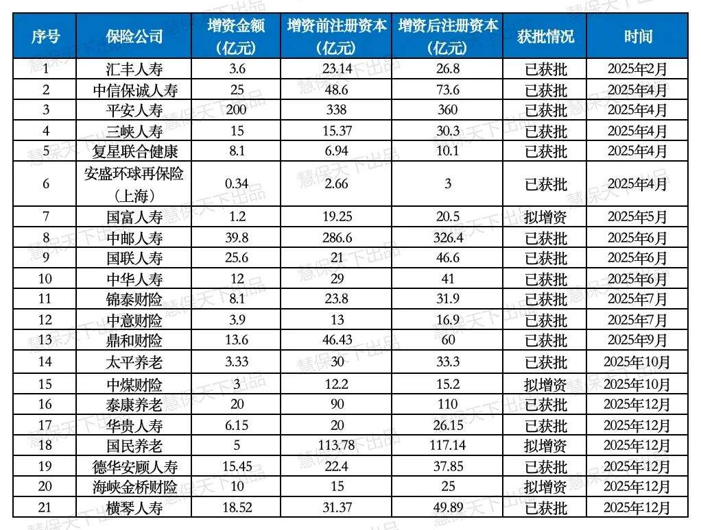 相比之下,增资看似更现实,实则同样艰难。2025年,全行业共有20家险企完成或拟进行增资,总规模419.2亿元,但资源分配的失衡问题极为突出:仅4家中大型险企便占据了63.2%的增资额度,其中平安人寿单次增资200亿元,中邮人寿增资39.8亿元;而16家中小险企合计仅获得154.4亿元增资,占比36.8%,单家平均增资额不足10亿元,远低于行业21亿元的平均水平。