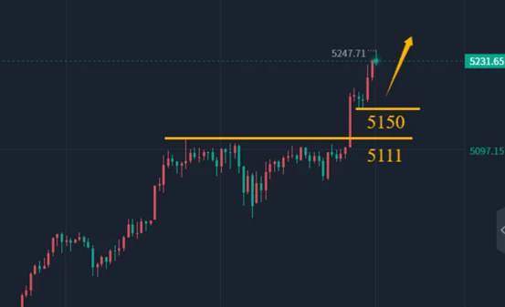 话不多说,投资朋友关注的可能还是今日操作方面,可以关注两个位置,一个是凌晨的突破点的顶底转换支撑5111附近,另一个隔夜突破加速大涨后停留的低点区域5150位置,当前价格距离顶底5111顶底转换位太远,参考价值不大,那么日内就围绕5150去择低布局多,欧美盘回踩修正后再结合支撑二次择机进多,如果激进5200整数关口上方短线去追个二三十美金问题也不大,做好风控即可。波动基数大,考验临场的点位把握切入,结合形态临盘跟进做多点,美盘突破日内新高之后还有继续跟进多,市场疯狂,我们谨慎但不怂,系