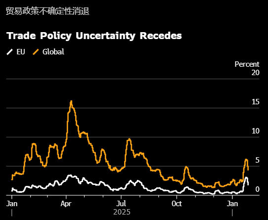美国总统特朗普威胁对部分欧洲国家征收关税所带来的经济影响可能有限。我们的欧盟贸易政策不确定性指数已回吐了1月份涨幅的一半左右。