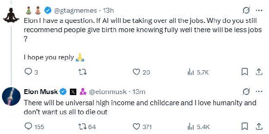有网友问,“埃隆,我有个问题。既然人工智能终将接管所有工作,你明明清楚未来就业岗位会减少,为什么还建议大家多生孩子呢?” 马斯克对此回应称:“将会有全民高收入和育儿福利,而且我热爱人类,不希望我们走向灭绝。”