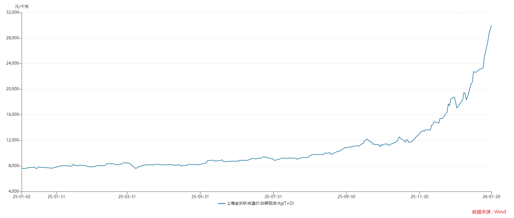 据Wind EDB数据,2025年,上海金交所白银现货价格持续上涨,三季度以来增长曲线开始变得陡峭,年末更是直接进入“飙涨”模式。2025年11月28日到2026年1月29日,其价格从12669元/千克迅速上涨至29998元/千克,2个月时间便实现翻倍。
