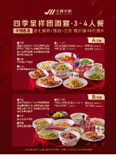 “双喜临门鸿运宴”专为年轻情侣或留守过年的小伙伴们设计,锅气十足的小炒牛肉、香气扑鼻的茄汁大虾、刘强东直播做菜的宿迁名菜“黄狗猪头肉”等菜品都在其中,温馨的节日氛围感拉满。“四季呈祥团圆宴”则瞄准三口之家或四人小聚,7道硬菜如鲜香酥脆的烤鸡、年味担当四喜丸子均可选择,无论在哪里过年,都是中国人的经典年味。“六六大顺如意宴”无疑是三代同堂或朋友聚餐的热闹之选,9道主菜涵盖臭鳜鱼、烤鸡、红烧肘子、酱牛肉等传统美味,兼顾祖孙三代的口味与节日氛围。
