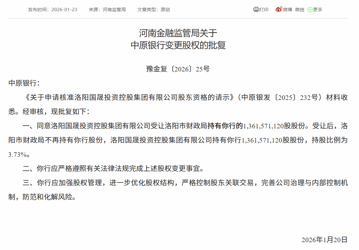 1月26日金融一线消息,河南金融监管局日前发布《关于中原银行变更股权的批复》,同意洛阳国晟投资控股集团有限公司受让洛阳市财政局持有该行的1361571120股股份。受让后,洛阳市财政局不再持有该行股份,洛阳国晟投资控股集团有限公司持有你行1361571120股股份,持股比例为3.73%。