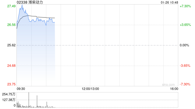 潍柴动力(02338)盘中涨超7%,截至发稿,股价上涨4.14%,现报26.68港元,成交额5.53亿港元。