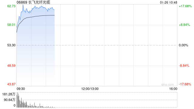 长飞光纤光缆(06869)盘中涨超16%,截至发稿,股价上涨14.82%,现报61.20港元,成交额15.35亿港元。