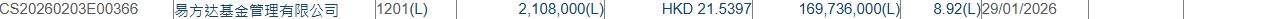 格隆汇2月4日丨根据联交所最新权益披露资料显示,2026年1月29日,中金公司(03908.HK)遭易方达基金管理有限公司在场内以每股均价21.5397港元减持210.8万股,涉资约4540.57万港元。