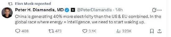 在其中一条帖子中,“零重力”公司创始人、奇点大学执行主席彼得·迪亚曼迪斯写道:“中国生产的电力比美国和欧盟的总和还要多出40%。在这场能源等于智能的全球竞赛中,我们必须开始觉醒了。”