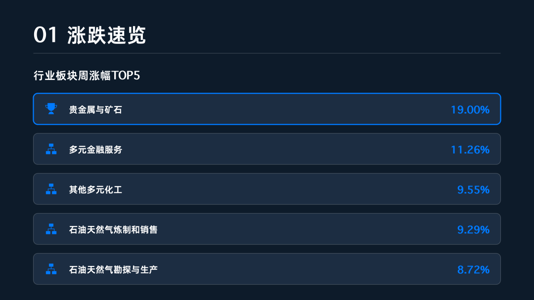 行业板块方面,资源与能源产业链成为本周最亮眼的明星,市场对“资源安全+通胀预期”的逻辑给予了认可 。材料行业以6.36%的周涨幅领跑全场,房地产、能源与工业板块紧随其后 。特别是在细分领域,贵金属与矿石板块单周涨幅高达19.00%,反映出资金在通胀逻辑下的强力进攻 。相比之下,金融、日常消费及医疗保健板块表现相对低迷,其中金融行业受银行、保险拖累整体下跌2.05%,成为市场主要的压制力量 。