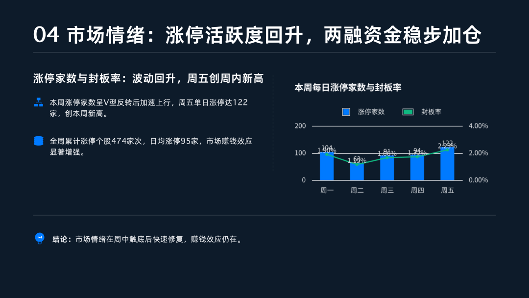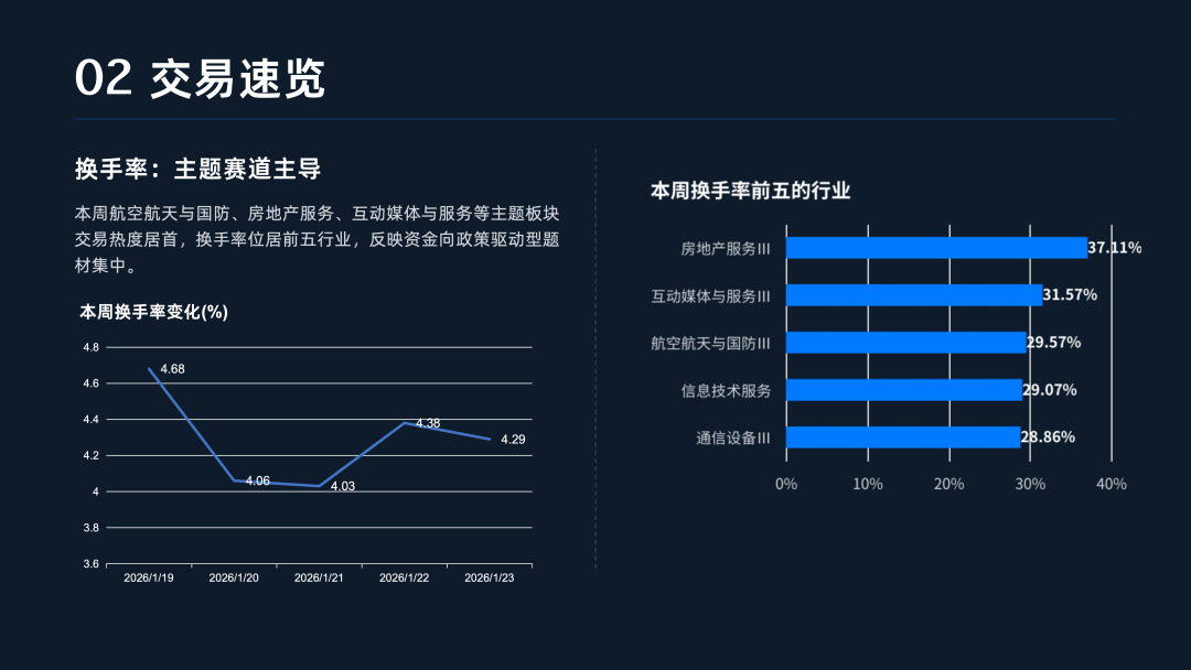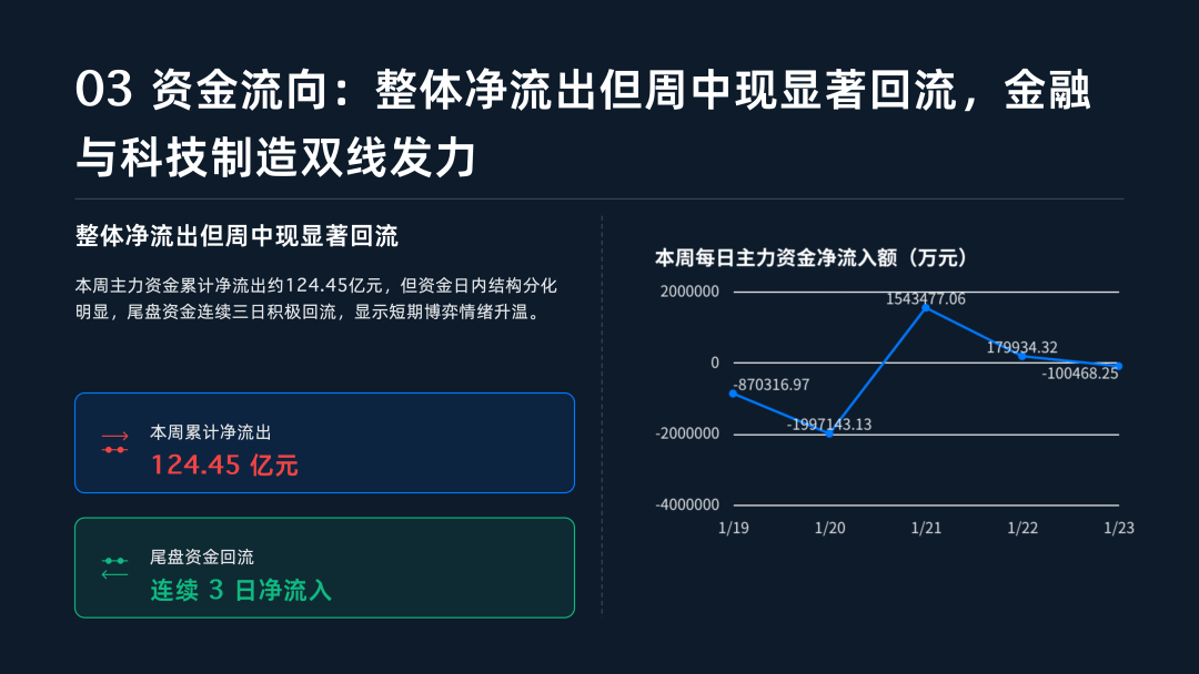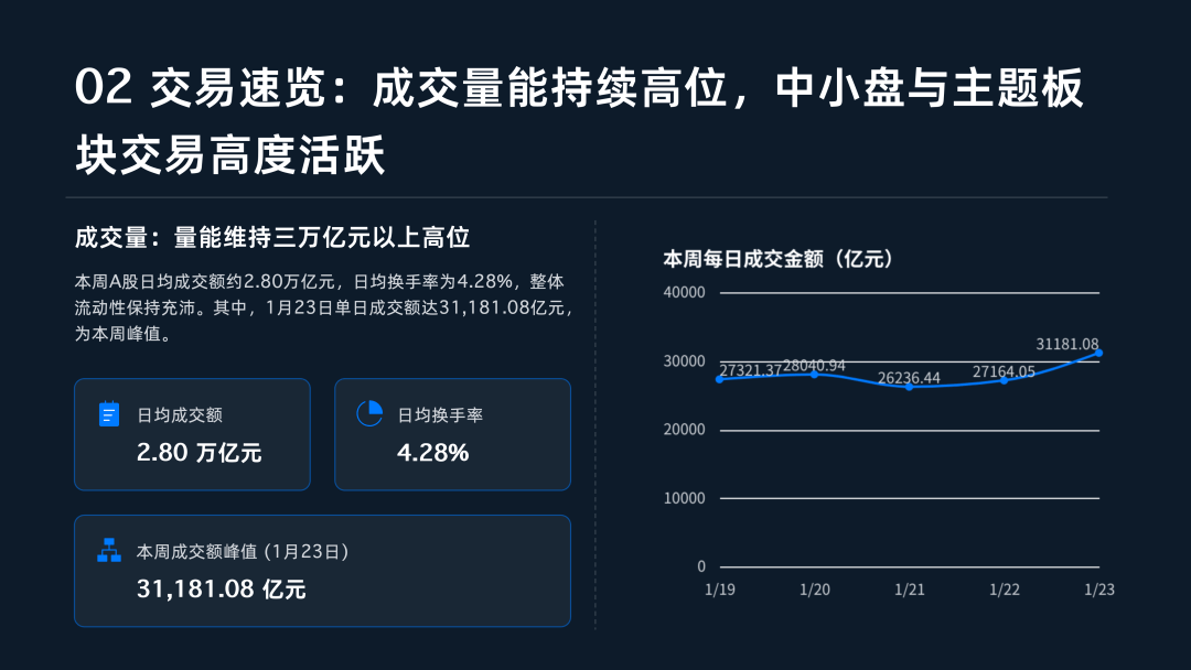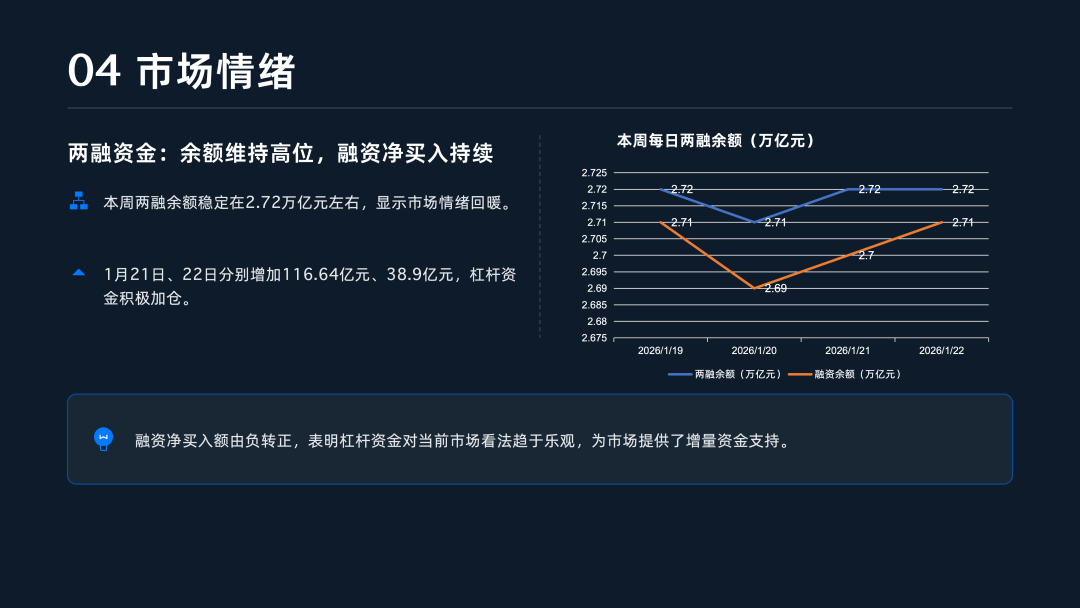 市场交易情绪在震荡中升温,本周日均成交额维持在2.80万亿元的高位,流动性保持充沛 。值得注意的是,1月23日单日成交额冲破3.1万亿元,较前一交易日大幅放量近4,000亿元,显示出在政策预期与主题轮动的推动下,市场交投活跃 。与此同时,短线情绪出现“V型”反转回升,周五涨停家数回升至122家,创下周内新高 。两融资金也表现出稳步态势,1月21日与22日融资净买入额合计超150亿元,杠杆资金入场意愿积极 。