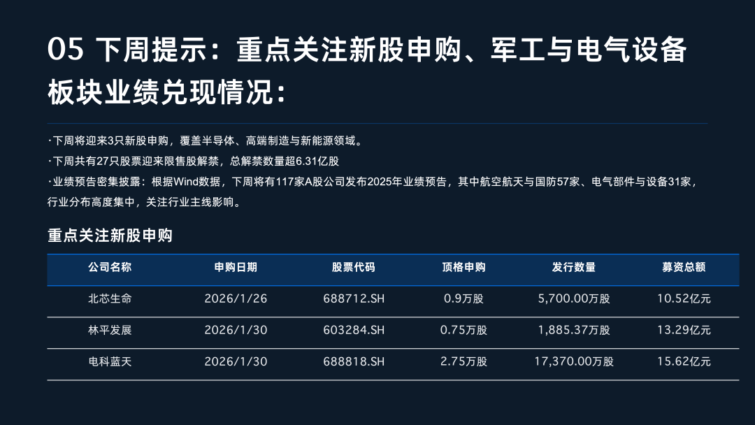 资金流向与后市关注方面,尽管主力资金全周累计净流出约124.45亿元,但尾盘资金连续三日呈现积极回流态势,尤其在周五尾盘净流入超30亿元,显示出短期博弈情绪正在修复 。展望下周,投资者需重点关注业绩预告的“试金石”效应,届时将有117家公司披露2025年业绩预告,其中航空航天与国防、电气部件与设备行业分布最为集中 。此外,下周还将迎来3只新股申购以及超6.31亿股的限售股解禁。