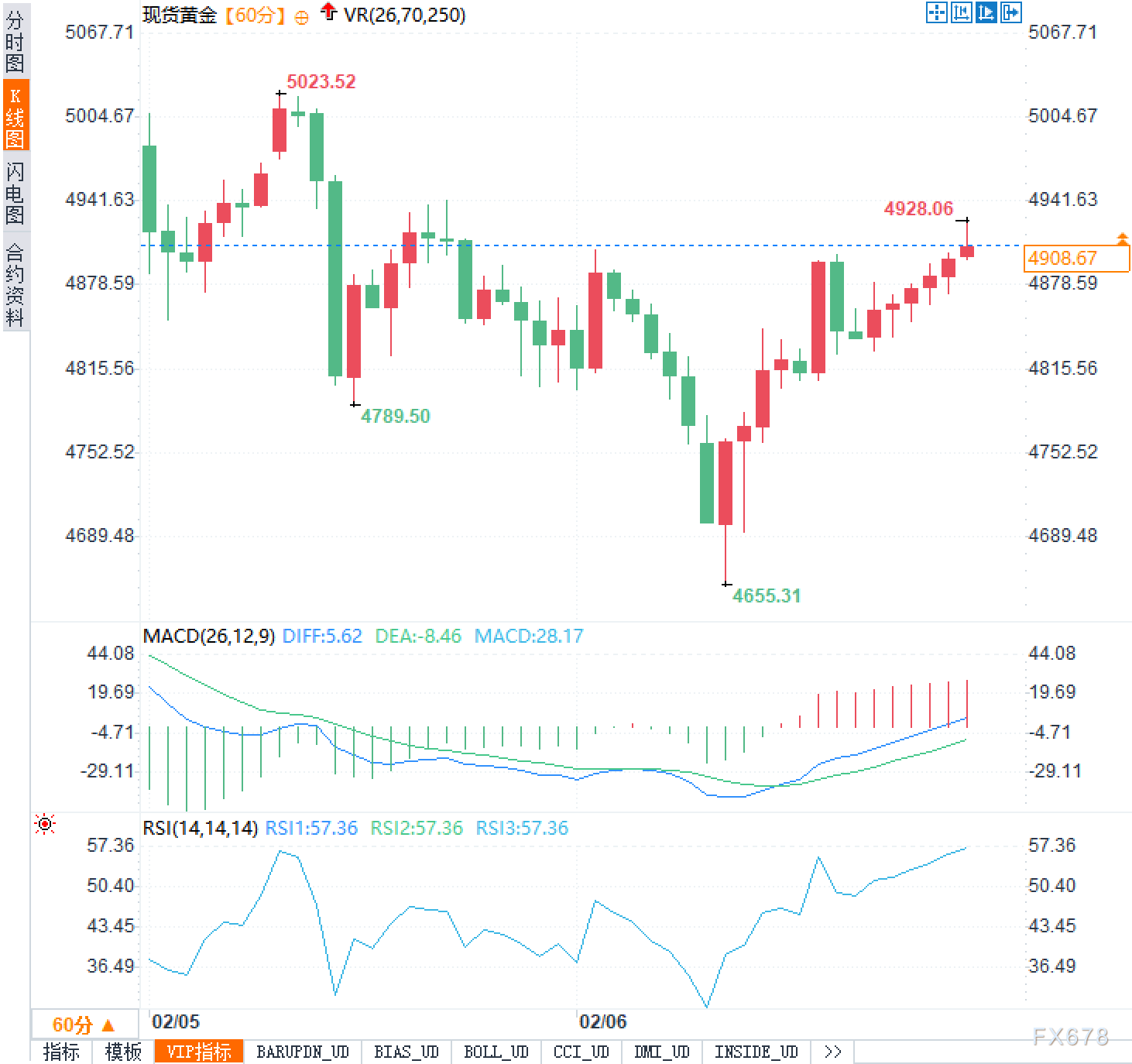 汇通财经APP讯――2月6日周五,现货黄金北美时段交投于4900美元上方,在经历此前从5023.52美元高位快速回落的剧烈调整后,价格在4655.31美元一线止跌反弹,显示出阶段性企稳迹象,表明多头正在尝试收复失地。虽然上方仍面临前高压力区的压制,但技术形态显示空头动能逐步减弱,市场情绪开始由恐慌转向观望甚至试探性做多。